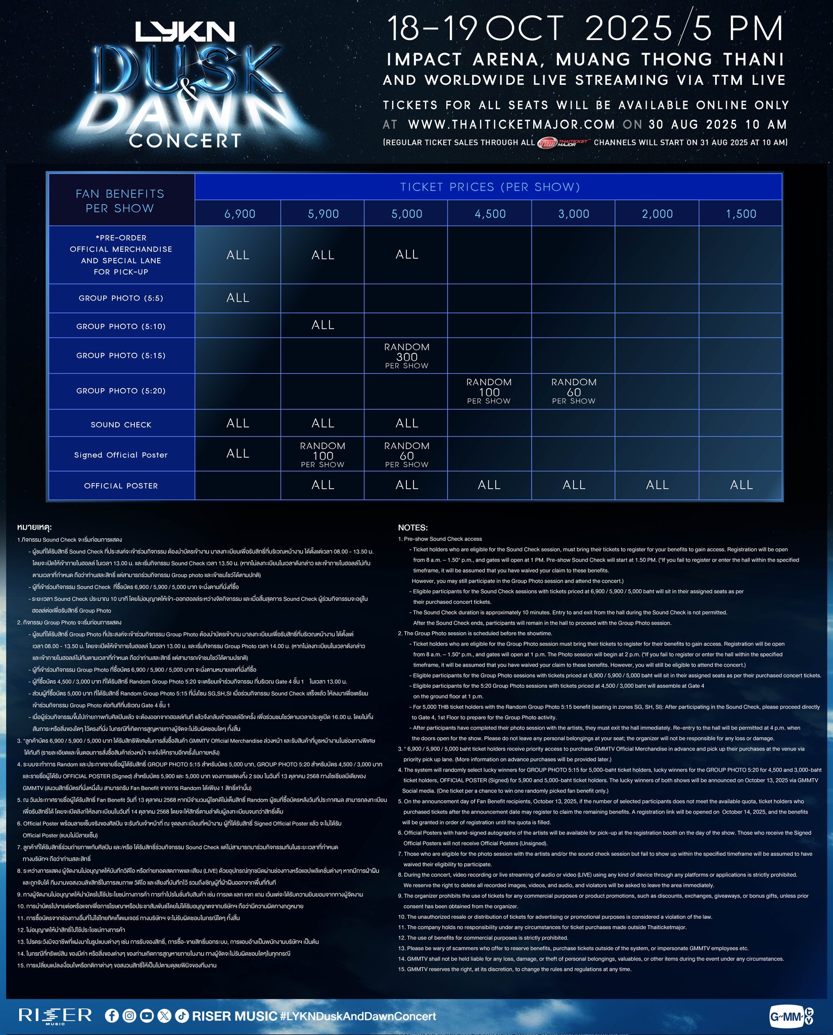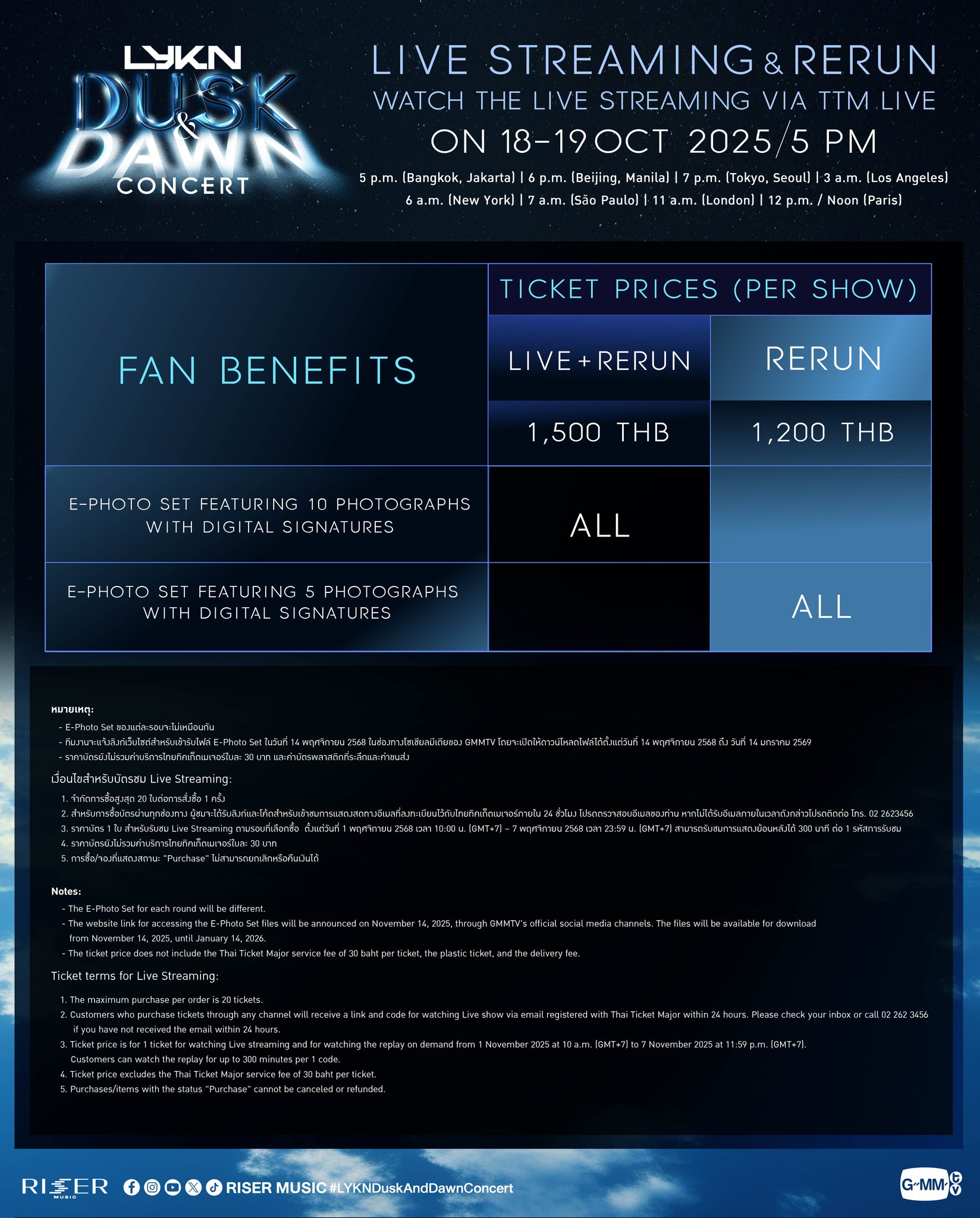 สำหรับผู้ที่สนใจเข้าร่วมชม “LYKN DUSK & DAWN CONCERT” สามารถจองบัตรบนช่องทาง Online ในวันเสาร์ที่ 30 สิงหาคม 2568 เวลา 10.00น. เป็นต้นไป โดยจะเปิดจำหน่ายบัตรทุกที่นั่งทาง Online ที่ thaiticketmajor.com เท่านั้น และเปิดจำหน่ายบัตรทุกช่องทางตามปกติ วันอาทิตย์ที่ 31 สิงหาคม 2568 เวลา 10.00 น. เป็นต้นไป ทางไทยทิคเก็ตเมเจอร์ ทุกสาขา , thaiticketmajor.com และ Call center โทร 0-2262-3456 บัตรราคา 6,900 / 5,900 / 5,000 / 4,500 / 3,000 / 2,000 และ 1,500 บาท และดูสดผ่าน TTM LIVE บัตรราคา 1,500 / 1,200 บาท (ลิ้งค์และโค้ดรับชม) (กรณีต้องการรับบัตรพลาสติกที่ระลึก ชำระเพิ่ม 30/ใบ) และติดตามรายละเอียดเพิ่มเติมได้ที่ thaiticketmajor.com หรือ facebook.com/gmmtvofficial & Instagram & X & TikTok & YouTube & Weibo : GMMTV