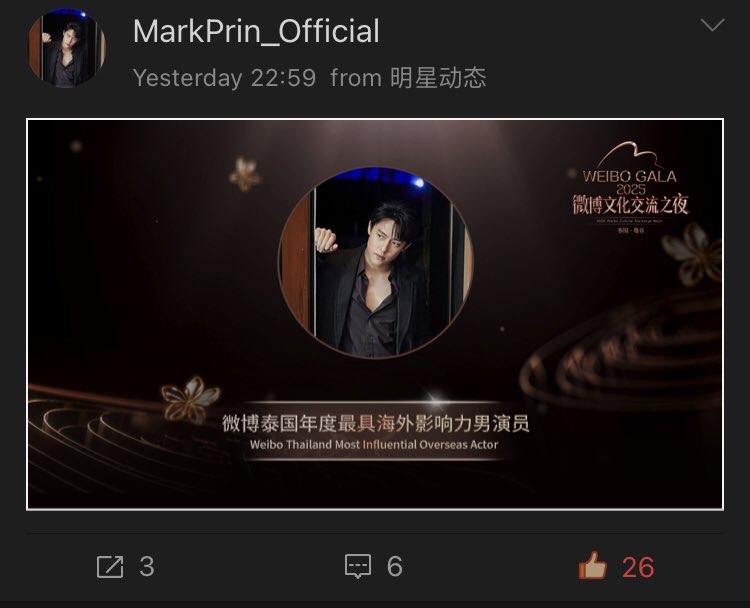 ความสำเร็จครั้งสำคัญของพระเอกหนุ่ม หมาก ปริญ สุภารัตน์ ยังคงเดินหน้าสร้างความภูมิใจให้แฟนๆ อย่างต่อเนื่อง ล่าสุดเจ้าตัวคว้ารางวัลนักแสดงผู้ทรงอิทธิพลระดับสากลแห่งปี Weibo Thailand Most Influential Overseas Actor จากงาน WEIBO GALA 2025 Weibo Cultural Exchange Night จากเวที WEIBO GALA 2025 : Weibo Cultural Exchange Night in Thailand 2025 ที่จัดขึ้นอย่างยิ่งใหญ่ ณ ศูนย์การประชุมแห่งชาติสิริกิติ์ เมื่อค่ำวันที่ 16 สิงหาคมที่ผ่านมา เพื่อเฉลิมฉลองความสัมพันธ์ไทย–จีน ครบรอบ 50 ปี