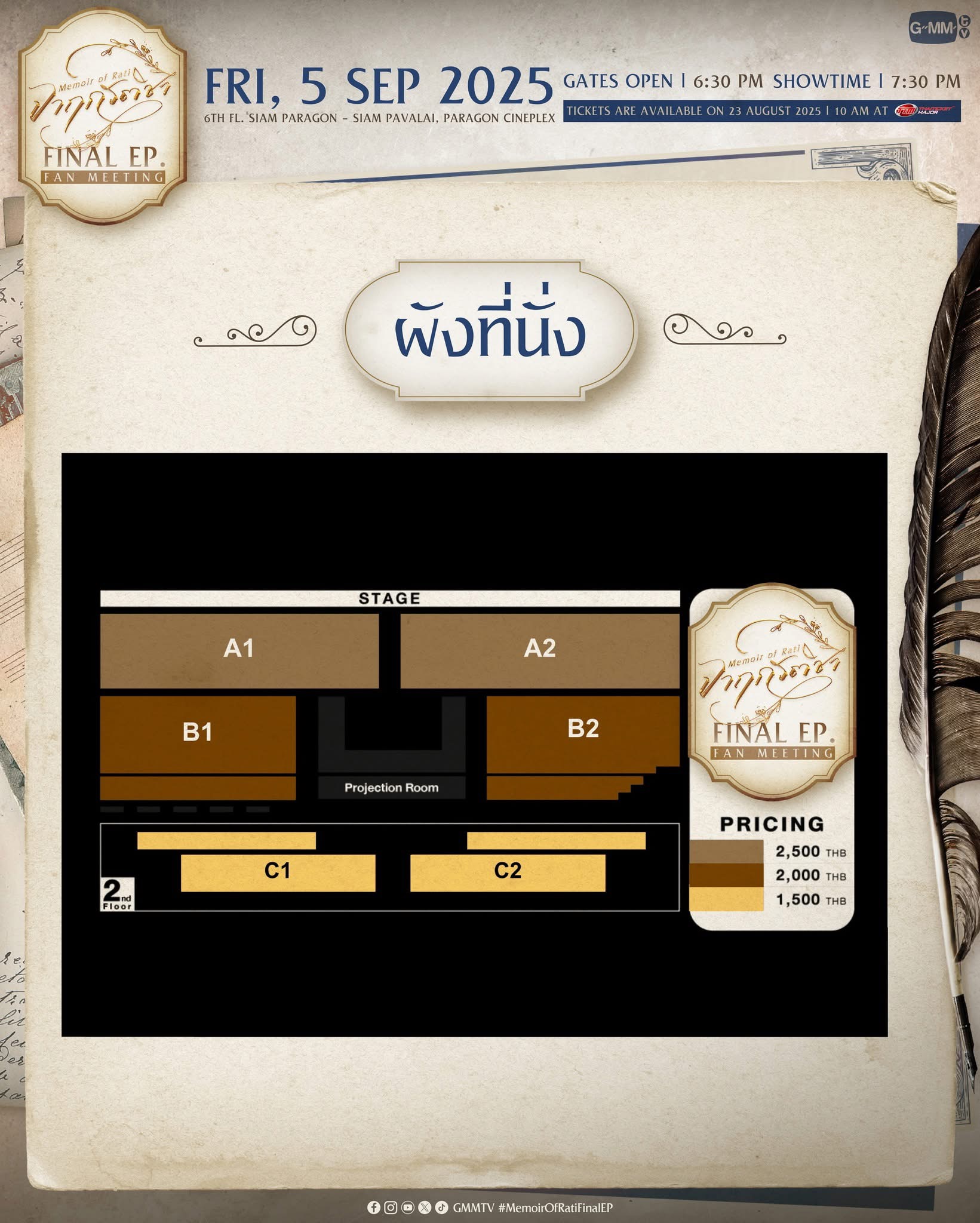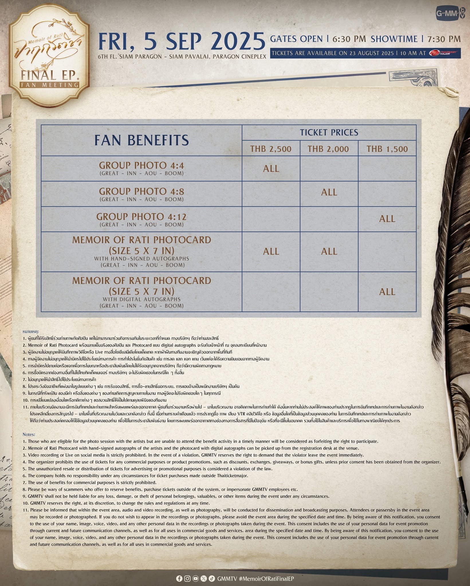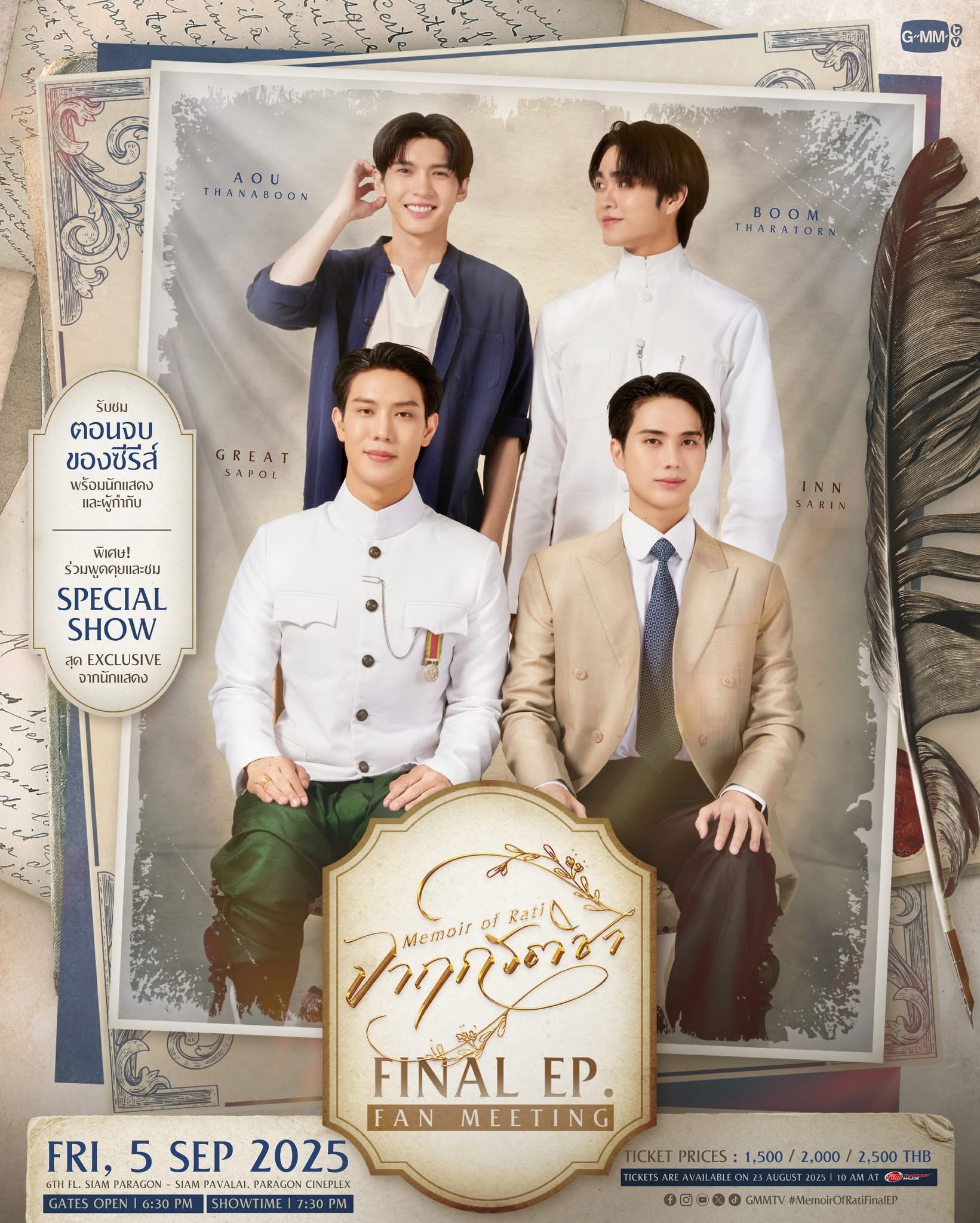 สร้างปรากฏการณ์เคมีความหวานสุดคลาสสิค ที่ทำถึงจนแฟนๆ พลาดไม่ได้ทุกสัปดาห์ สำหรับซีรีส์กระแสฮอต “จาฤกรติชา Memoir Of Rati” บันทึกรักที่ต้องเก็บซ่อนไว้ แต่ชัดในใจทุกถ้อยคำ ซีรีส์วายพีเรียดสุดเข้มข้น เรื่องแรกจาก “GMMTV” คอนเทนต์โพรไวเดอร์ชั้นนำของเมืองไทย กับการพบกันอีกครั้งของนักแสดงคู่ฮอตสุดปัง “เกรท สพล อัศวมั่นคง” และ “อิน สาริน รณเกียรติ” ร่วมด้วยคู่จิ้นสุดฮอต “อู๋ ธนบูรณ์ เกียรตินิรันดร์” และ “บูม ธราธร จันทรวรกาญจน์” เดินทางมาถึงบทสุดท้าย ชวนแฟนๆ มาร่วมเขียนบันทึก รักแท้บทสุดท้าย และลุ้นตอนจบไปกับความรักต่างชนชั้น พร้อมโชว์สุดพิเศษจากเหล่านักแสดงที่เตรียมมามอบให้แฟนๆ ได้ดื่มด่ำ ไปกับความละมุนสุดโรแมนติก พร้อมด้วยผู้กำกับมากฝีมือ “ณัชชานิษฐ์ จิรรุ่งโรจน์” มาร่วมพูดคุยการทำงาน ทั้งเบื้องหน้าเบื้องหลังและความสนุกในการทำงานแบบเอ็กซ์คลูซีฟจากเหล่านักแสดง ในงาน “จาฤกรติชา Final EP. FAN MEETING” วันศุกร์ที่ 5 กันยายน 2568 เวลา 19.30 น. ชั้น 6 สยามพารากอน โรงภาพยนตร์สยามภาวลัย Paragon Cineplex มาร่วมเก็บบันทึกทรงจำที่สวยงามไปพร้อมๆ กัน